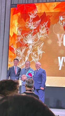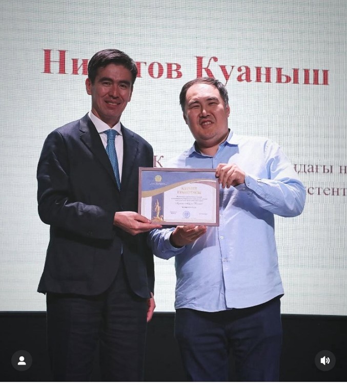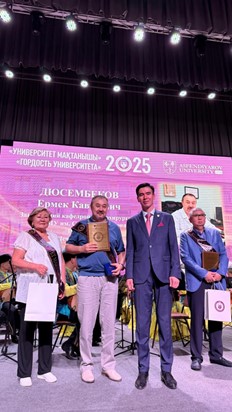 Presentation of the “Altyn Ustaz” (Golden Teacher) Medal, III Degree, from the Akimat of Almaty to Gani Zhaishylykovich Akhanov, Associate Professor of the Department. 2025.