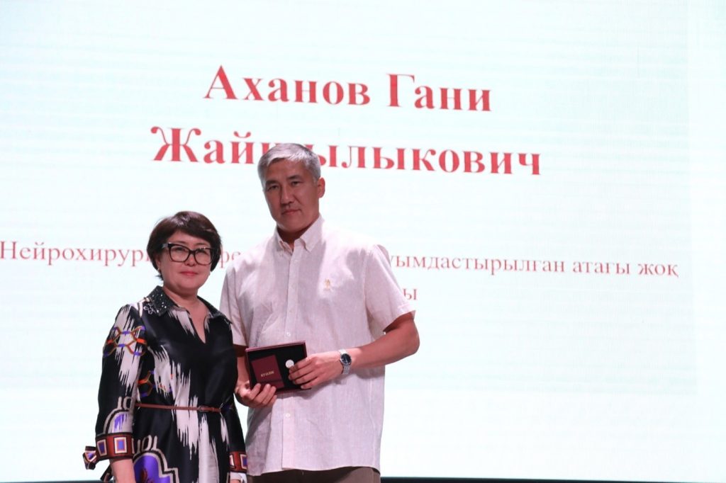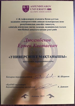 Presentation of the “UNIVERSITET MAQTANYSHY” (“University Pride”) Medal by Rector M. E. Shoranov of Asfendiyarov Kazakh National Medical University to Yermek Kavtaevich Dyusembekov, Head of the Department of Neurosurgery. 2025.