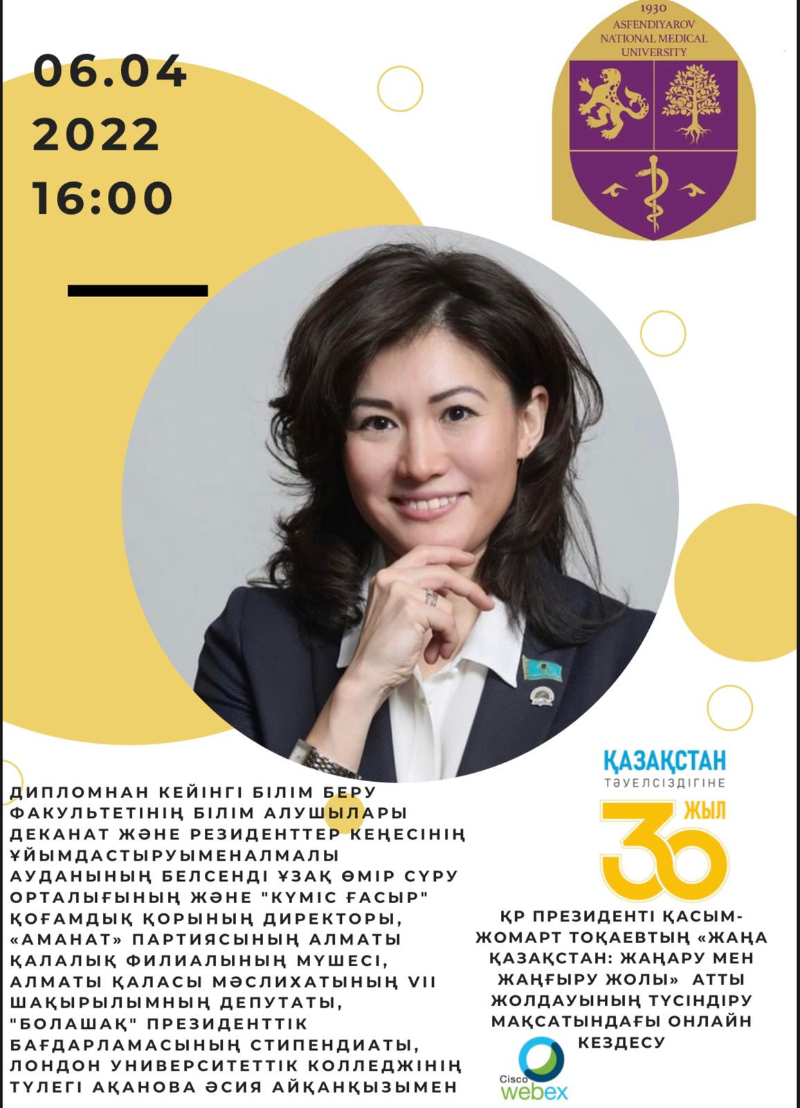 2022 жылғы 6 сәуірде онлайн режимде ҚазҰМУ дипломнан кейінгі білім беру факультетінің резиденттері Алмалы ауданының белсенді ұзақ өмір сүру орталығының және “Күміс ғасыр” ҚҚ директоры, “Аманат” партиясының Алматы қалалық филиалының мүшесі, Алматы қаласы мәслихатының VІI шақырылымың депутаты Ә.Ақановамен кездесті. Бұл кездесудің мақсаты Мемлекет Басшысы Қасым-Жомарт Тоқаевтың Қазақстан халқына “Жаңа Қазақстан: Жаңару мен Жаңғыру жолы” атты Жолдауын түсіндіру болды.